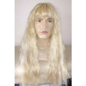 Long golden blonde wavy with short layered bangs and slightly darker roots. This was a display model. One left. Nice quality high heat fiber. 25 inches long.